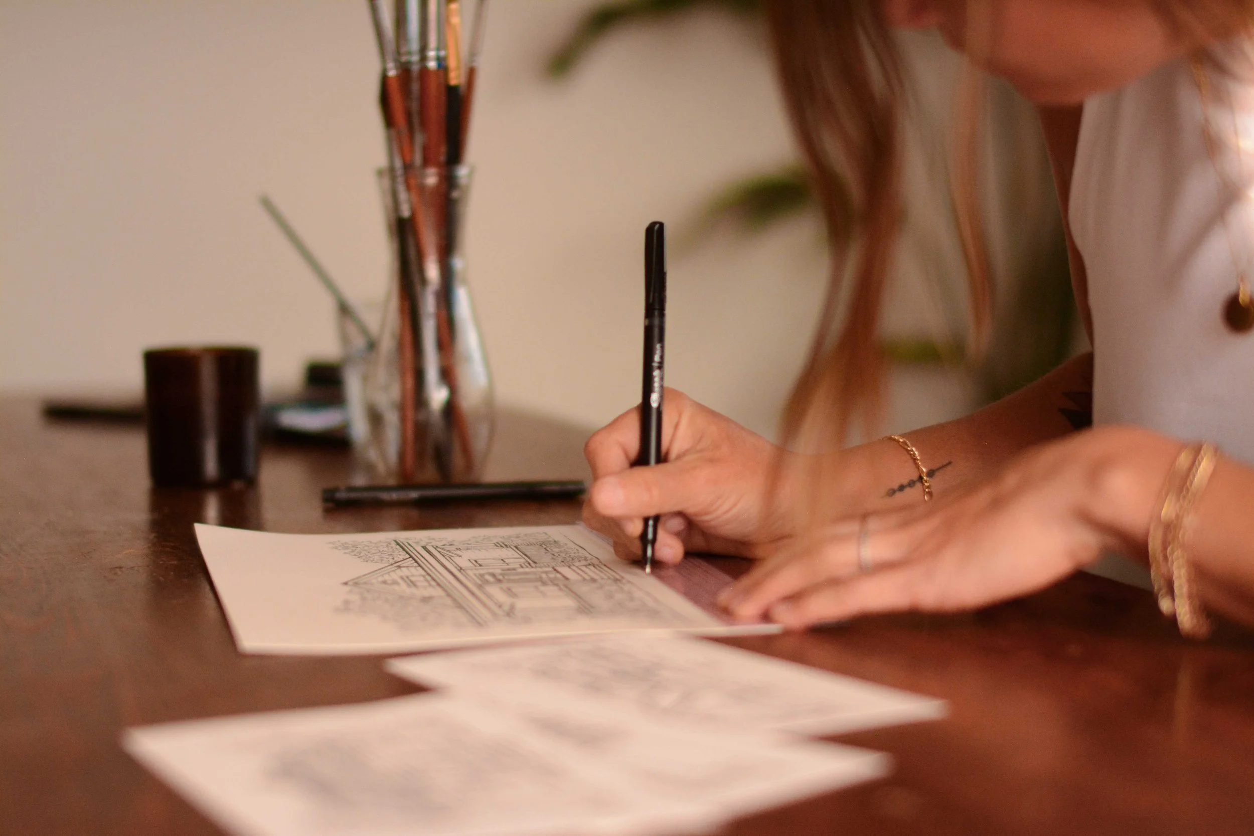 Megan Gets to Work: Given your photos and details, Megan hand-draws every aspect with ink. Her work captures the essence of the new home, making it a personal and expertly crafted piece far from digital art.